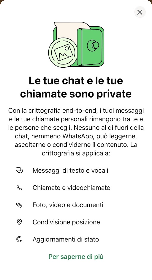 Questo stesso pragmatico lo vediamo anche aprendo una qualunque chat di whatsapp, che sostiene che nessuno (nemmeno whatsapp stessa) possa leggere i messaggi per via della crittografia (aprite una chat nuova e vedrete un banner come quello qui sotto).
