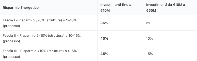 Il credito d'imposta si articola in una tabella che premia in modo crescente i progetti con maggiore efficientamento energetico. Dopo le modifiche introdotte dalla Legge di Bilancio 2025, la struttura è organizzata su due scaglioni di investimento e tre fasce di risparmio energetico: